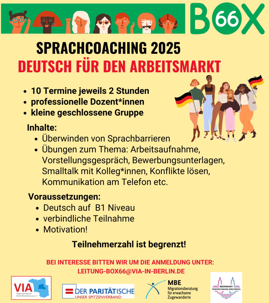 Die Migrationsberatung für erwachsene Zugewanderte (MBE) in der BOX66 lädt interessierte Frauen zur kostenfreien Infoveranstaltung für das Sprachcoaching „Deutsch für den Arbeitsmarkt“ am 10.04.2025 um 18:00 Uhr ein. Anmeldung hierfür bitte per E‑Mail an Inna Schulze. Das kostenfreie Sprachcoaching umfasst dann 10 Termine á 2 Stunden.