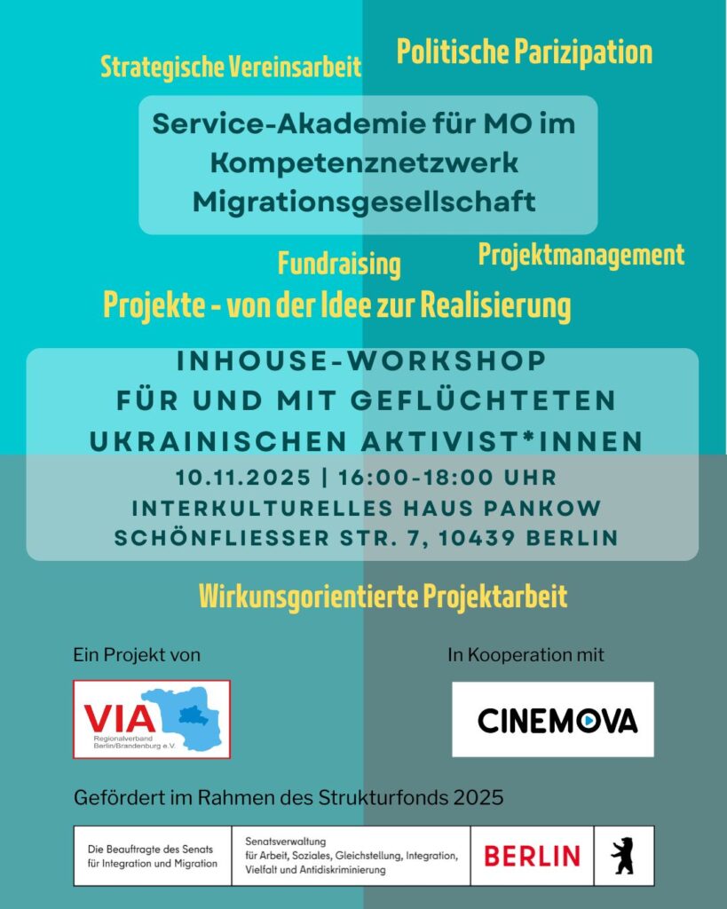 In Koop­er­a­tion mit Cin­eMo­va Ukrain­ian Empow­er­ment Net­work e.V. bietet die VIA Ser­vice-Akademie für MO im Kom­pe­ten­znet­zw­erk Berlin­er Migra­tions­ge­sellschaft einen Inhouse-Work­shop für geflüchtete ukrainis­che Aktivist:innen an. Die The­men bes­tim­men die Teil­nehmenden auf Basis ihrer Fra­gen (z. B. Pro­jek­t­man­age­ment — von der Idee zur Real­isierung, wirkung­sori­en­tierte Pro­jek­tar­beit, Fun­daris­ing usw.).